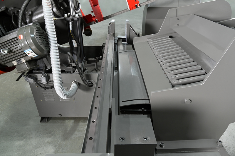 Thiết bị dẫn hướng được lắp đặt trên dầm khung cưa bao gồm các tay dẫn hướng trái và phải và các đầu dẫn hướng. Cả hai tay dẫn hướng bên trái và bên phải đều có thể di chuyển dọc theo đuôi khớp. Khoảng cách giữa hai tay dẫn hướng có thể được điều chỉnh rộng hơn khoảng 40mm. kích thước của phôi. Thiết bị dẫn hướng dùng để thay đổi góc lắp đặt lưỡi cưa sao cho lưỡi cưa vuông góc với bàn làm việc. Để đảm bảo độ chính xác khi cắt của lưỡi cưa và giảm độ rung, một bộ bánh xe dẫn hướng (vòng bi lăn) và. Khối dẫn hướng chống mài mòn được lắp đặt ở hai tay dẫn hướng bên trái và bên phải. Mặt sau của lưỡi cưa cũng có kết cấu ổ trục kép có thể xoay lên xuống phù hợp.